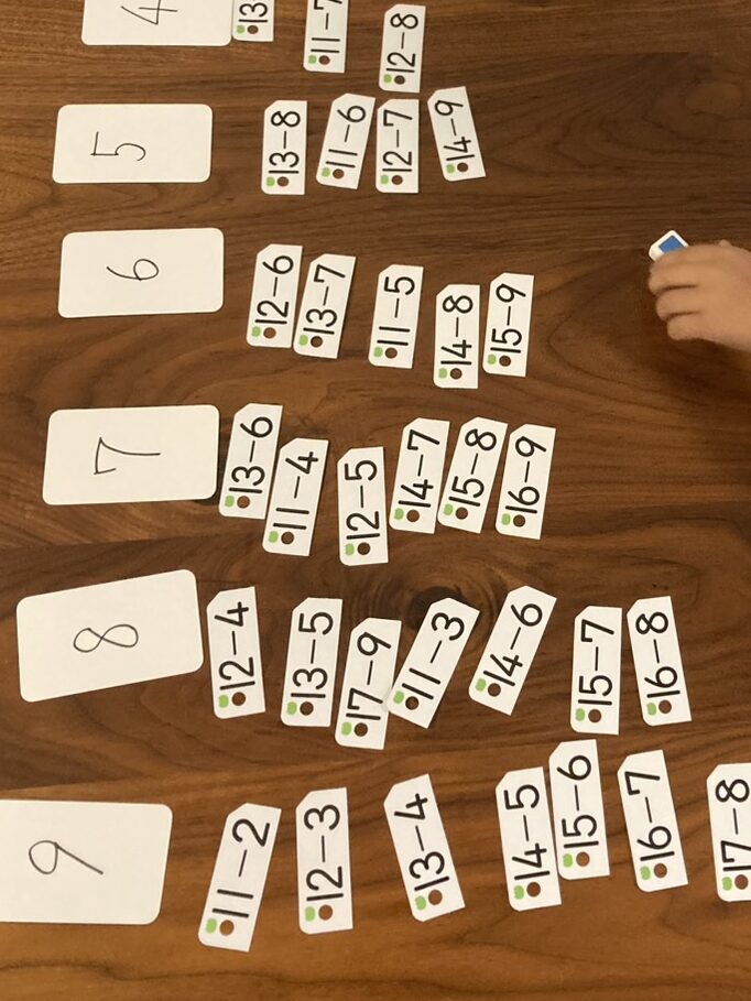 本来は問題集でコツコツ練習する予定でしたが…実は、授業の冒頭でたけちゃんの様子を見ると、いつもより少し元気がありません。「机に向かうモードじゃないな」と判断し、急きょ 活動的な“計算カード仲間分け”に変更 しました。