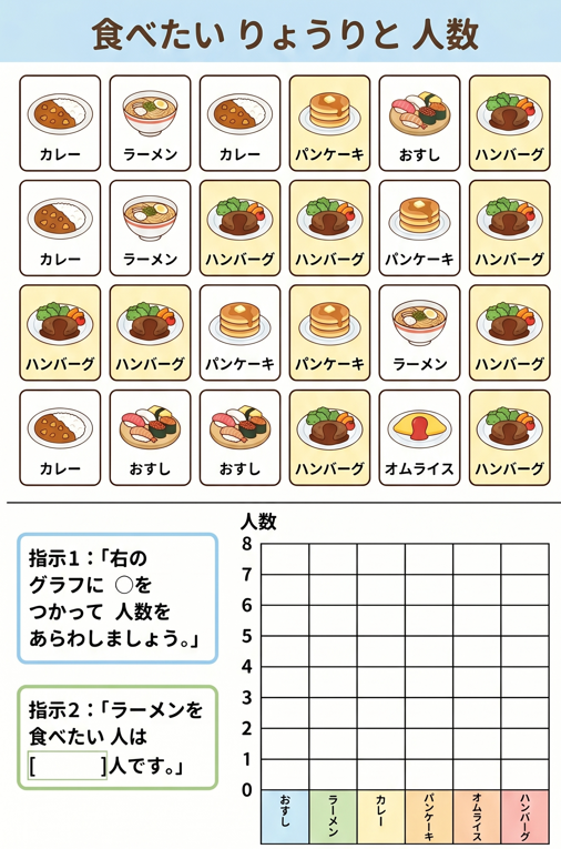 算数の時間、たけちゃんは2年生の先取り学習として「グラフ作成」に挑戦しました。 クラスの友達が食べたい料理(カレー、ラーメン、寿司、ハンバーグ)が書かれた合計24枚のカードを数え、グラフに「○」を書き入れていく問題です。